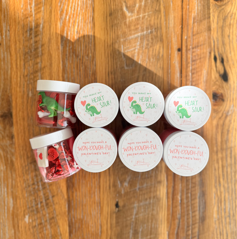 Make Valentine’s Day extra fun for the whole class! These 4 oz playdough jars come in sets of 10, available in either Basic Valentine’s or “You Make My Heart Saur” (Dinosaur) themes. Perfect for classroom celebrations, party favors, or group gifts, with the option to add individual jars after the 10-pack and customize with a "from" name.
