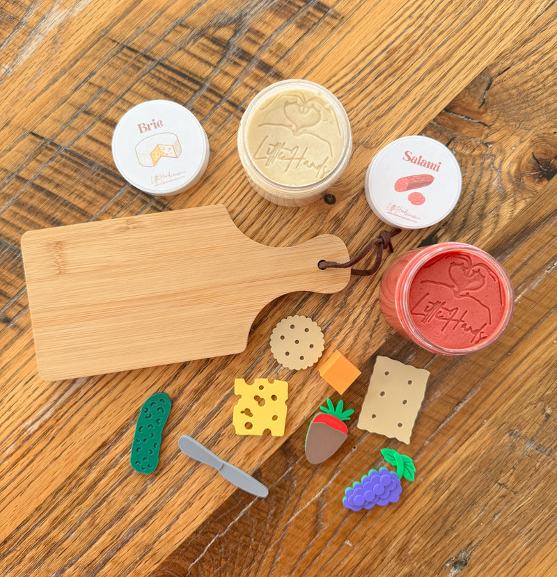Let your little foodie create the ultimate snack board with our Charcuterie Playdough Kit! This beautifully curated sensory set comes with two luxe playdoughs — creamy white for "brie" and rich red for "salami" — plus an assortment of realistic, kid-sized 3D printed pieces to complete the spread.